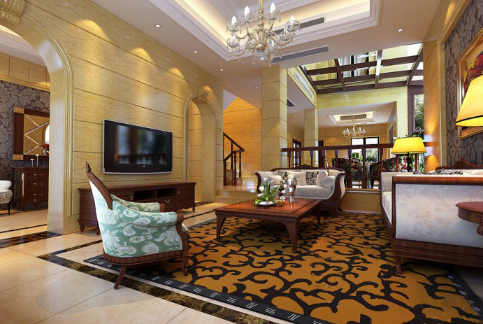 雅致的背景造型、考究的配飾、精湛的工藝,均是現(xiàn)代與古典相融的結(jié)晶,讓主人的審美情趣在優(yōu)美的線條、和諧的色調(diào)中自然流露。從玄關(guān)到客廳再到餐廳,空間流暢通明,名貴內(nèi)斂的淺調(diào)天然石料是地面和墻身的主材,石材與原木飾面墻壁形成鮮明而自然的對(duì)比。純凈的米色奠定了居室的基調(diào),放棄傳統(tǒng)歐式風(fēng)格中繁復(fù)的曲線與雕花后,明快的直線條勾勒出空間的清爽氣質(zhì)?!】蛷d的沙發(fā)背景運(yùn)用了西班牙米黃仿古石飾面中間用石材線條內(nèi)貼墻紙,墻紙中間掛上一幅藝術(shù)油畫,視覺效果既豐富又有立體感。一套大氣的組合歐式沙發(fā)配上實(shí)木的茶幾顯得主人家的品位。并彌漫出一份現(xiàn)代而古典的韻味。