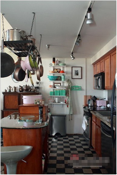廚房貌似一個雜物間,雜七雜八的東西都放置在廚房間,特別是吊掛的鐵甲設(shè)計,更像是修理庫,把廚房區(qū)域設(shè)計的很獨特。另一頭白色的收納架擺放著各種色彩艷麗的廚房用具,讓暗沉空間變得亮堂一點。