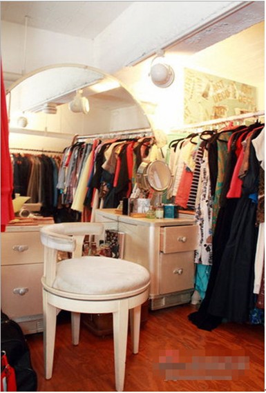 臥室另一頭的梳妝臺,有點復(fù)古味兒。一側(cè)體積龐大的衣帽空間,掛滿了當(dāng)下季節(jié)新潮的衣服,半個橢圓形的鏡子讓空間狹窄的衣帽間的視覺空間放大一倍的。