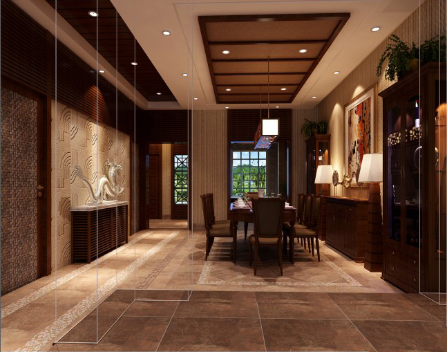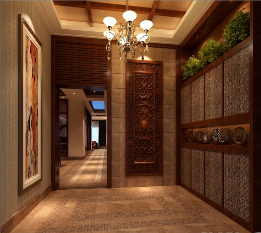 一進門廳,就能讓你感到中式的那種氛圍,感到主人家的居家品位。門廳的對面是墻上是一個很有中國傳統(tǒng)特色的門雕花格窗,門廳的鞋柜是用來給主人回家及出門方便的一個鞋帽柜,鞋柜用花梨木做的框架,柜與柜之間留35公分的裝飾格,柜里留燈管槽位,里面可以擺些各種各樣的裝飾物品,鞋柜的頂上可以放好幾盆植物,燈光一打效果更加明顯。門頂?shù)捻斠彩菢O顯中式元素,頂周圍走一圈木線,中間是6*6木方做的線條造型。地面用的是仿古地磚中用馬賽克做的方形拼花。