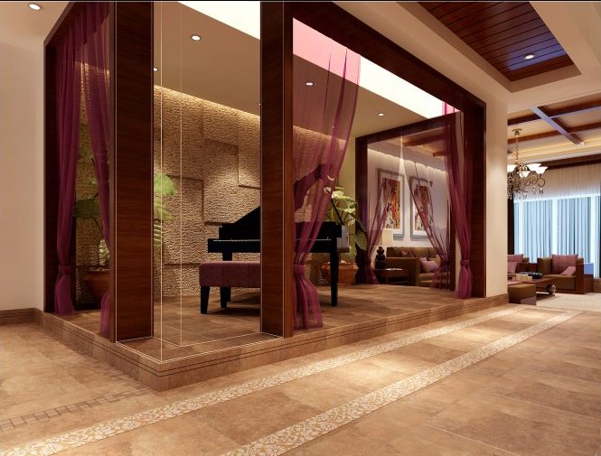 客廳旁邊的房間是鋼琴室,房間做成開方放的,墻與墻之間都是用的實木門套做邊框,再用粉紅色的沙簾做裝飾,背面墻上是用凹凸的板材打底,然后涂刷液體墻紙。地面抬高15公分與踢腳同高,上面放一臺鋼琴,平時一家聚會的時候,女孩彈琴,一家人做觀眾,你想想這種畫面,真是多么愜意的啊。