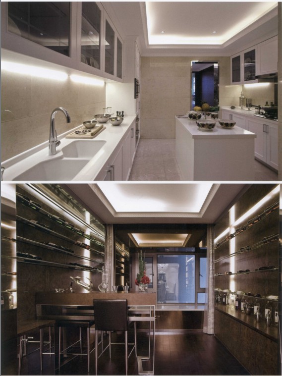 廚房與酒柜吧臺(tái)的設(shè)計(jì)是完全兩種色調(diào),一個(gè)過門,一個(gè)轉(zhuǎn)角兩個(gè)完全不同的空間。廚房里的簡約色調(diào),酒柜吧臺(tái)的深色浪漫都是為生活,為居家而準(zhǔn)備著。
