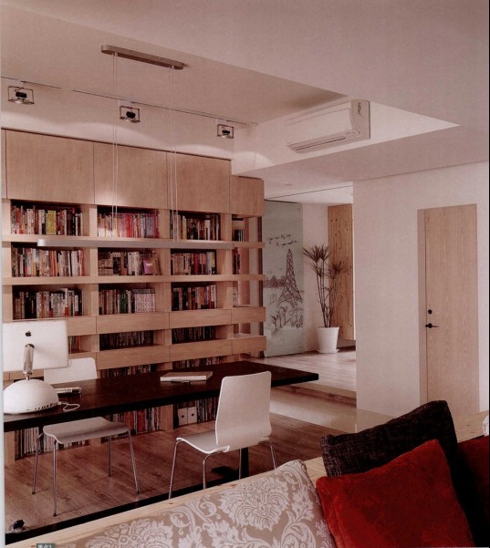 為滿足各種尺寸的書(shū)籍及CD片收納,設(shè)計(jì)以木作量身定制層板,并以門片變換柜體,豐富書(shū)墻的“功能”。