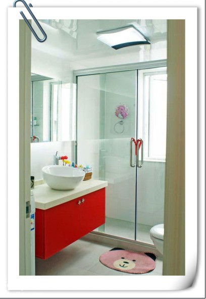 新房衛(wèi)生間設(shè)計(jì)也要充滿些喜氣味,越是小的空間更能營(yíng)造出溫馨的氛圍。一個(gè)大紅色的浴室柜就能很好的打破冰冷的衛(wèi)生間氣氛,可愛(ài)粉色小熊防滑毯也能起到裝飾作用。淋浴房的把手也系上了紅色的絲帶,增加幾分甜蜜。