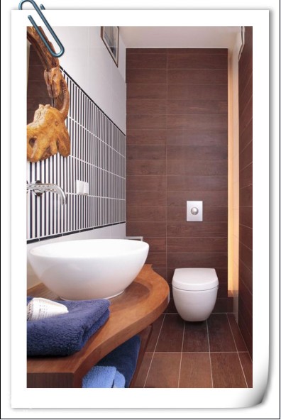長(zhǎng)而狹窄的衛(wèi)生間也能打造出氣派寬敞的空間效果,并有著自己的風(fēng)格。棕色的啞光地板磚讓整個(gè)空間顯得低調(diào)沉穩(wěn),同時(shí)又很有質(zhì)感。浴室柜和浴室鏡框都采用了木質(zhì)材料,富有質(zhì)感且充滿自然風(fēng)味。黑白兩道的條紋瓷磚給這個(gè)空間帶來(lái)不一樣的氣息,有點(diǎn)現(xiàn)代感的裝飾,卻也和整個(gè)空間裝飾相協(xié)調(diào)。