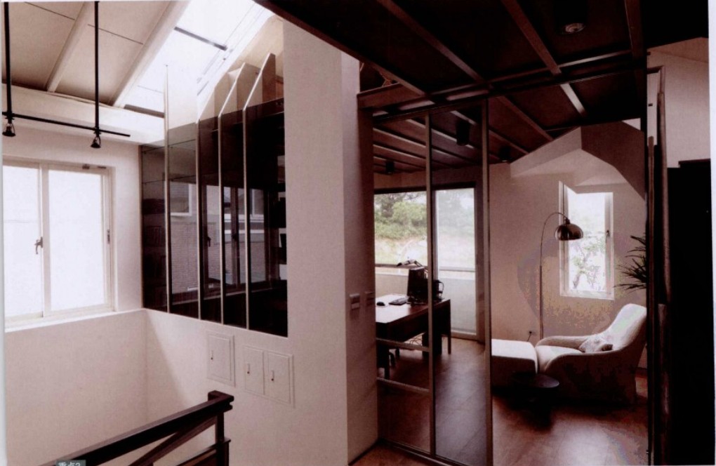 設(shè)計(jì)師運(yùn)用開放式空間規(guī)劃,減少木作的使用,以突出挑高、無(wú)壓的空間優(yōu)勢(shì),并使用環(huán)何涂料及原木地板等環(huán)保建材,不只在于健康空間的營(yíng)造,也讓受閱讀的屋主所收藏的書籍有適當(dāng)?shù)氖占{空間。保留斜屋頂,將挑高的區(qū)域規(guī)劃為閣樓,充分采光的天窗及玻璃扶手隔屏連接書房,滿足了收費(fèi)也營(yíng)造了良好的閱讀氛圍。