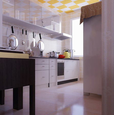 此戶型為兩室一廳的房間,面積不大,基本上是沒(méi)有餐廳的位置,為了讓空間看起來(lái)擴(kuò)大些,設(shè)計(jì)師把原始的廚房墻打掉,做成一個(gè)開(kāi)放式的現(xiàn)代廚房,并在餐廳及廚房中用用一些實(shí)木線條做隔墻。并噴上白色的油漆。廚房的櫥柜面板采用的是白色烤漆板,配上黑色的大理石臺(tái)面顯得整齊又大方,廚房功能是儲(chǔ)存生活的必備,平時(shí)做飯也就是儲(chǔ)存,洗滌和烹調(diào)。由于廚房的空間不大,但功能卻很多,廚柜的每一個(gè)抽屜內(nèi)部的功能都是不一樣的,各種內(nèi)置式的抽屜和金屬拉藍(lán)。給主人提供了方便的操作空間。廚房的頂采用黃白相交的方形鋁扣板。地面鋪600*600的防古地磚一直延伸到客廳。餐廳的餐桌選用的是胡桃木配上軟軟的黃色布藝墊。餐廳的燈光既不能太強(qiáng)又不能太弱,燈光要以溫馨的黃色為基調(diào),再配上藝術(shù)吊燈?餐廳旁邊的白色墻上也可以掛上一幅藝術(shù)油畫(huà)。增加房間的藝術(shù)氣息。