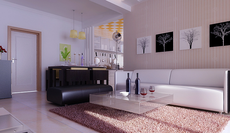 客廳對(duì)于家庭成員來(lái)說(shuō),除了是多功能的,多用途的空間,還是生活空間的中心,它用了餐廳在廚房及客廳的一個(gè)過(guò)渡來(lái)建立一個(gè)獨(dú)立分區(qū),使一家盡情的看電視及聽(tīng)音樂(lè)??蛷d設(shè)計(jì)采用了簡(jiǎn)約現(xiàn)代的風(fēng)格,這與個(gè)人文化背景和家庭修養(yǎng)的基礎(chǔ)上,設(shè)計(jì)有自己特色的居室風(fēng)格。房屋的結(jié)構(gòu)上,要以最大限度地獲得了自然采光。電視背景墻采用了直線的石膏板做簡(jiǎn)易的直線造型,內(nèi)貼暖色的豎紋墻紙,并配上一條從頂?shù)降氐牟枭A?,使客廳有了明顯的延伸空間。黑白配的沙發(fā)圍繞著玻璃茶幾,沙發(fā)獨(dú)立成組靠在一角。地毯用的是毛絨絨的毛線地毯。給人一種舒適安靜的感覺(jué)。沙發(fā)背景沒(méi)有做多的裝飾,只是整面墻貼豎紋的墻紙,面墻上的藝術(shù)畫(huà)也是黑白配,客廳的整體效果相協(xié)調(diào)。相呼應(yīng)。