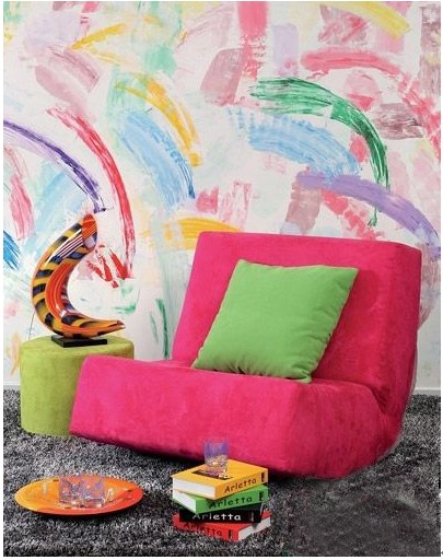 五顏六色的涂鴉墻面,玫紅色單身休閑沙發(fā),綠色靠枕,讓這個空間變的童真味十足。清新亮麗的玫紅色和草綠色相互搭配,讓整個沙發(fā)的時尚感氣息變濃郁,外加上特殊的搖椅式造型,也很受年輕人的喜愛,與五彩斑斕的墻面搭配在一起,顯得溫馨而又自由。