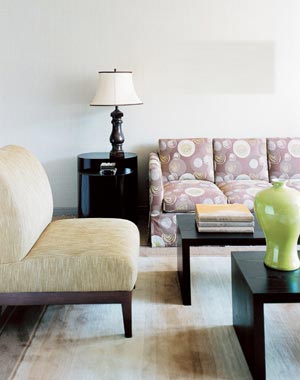 極致簡(jiǎn)約而略嫌生硬的現(xiàn)代家具,會(huì)因布藝與飾物的裝點(diǎn)變得生動(dòng)。造型上的方與圓,材質(zhì)上的棉與麻,色彩上的白與綠,看似不很和諧的元素,也能在巧妙的混搭中,呈現(xiàn)隨性的舒適感。
