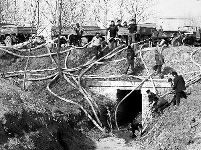 而在引水渠不到30米的水邊,已擁擠著13輛拖拉機和奔馬車。大家爭著把水泵往水里放,“水泵緊挨著水泵?!?/P>