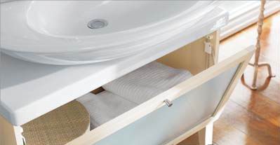 為了迎合人們希望盡可能充分利用空間的需要,現(xiàn)在很多浴室家具不僅僅具有一項(xiàng)功能,例如圖中所示的坐椅,表面有可以打開(kāi)的蓋子,蓋子一面是鏡子,可用于化妝,而椅坐里面還可以放一些零碎物品。高一些的帶抽屜的柜子也是如此。