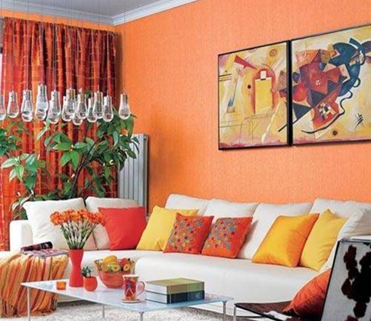 沙發(fā)背景墻面以大面積的橙色裝飾,與窗簾的色彩保持一致,改變了居室的整體視覺效果;墻面裝飾著抽象的畫框,避免大面積的背景色不會(huì)太平庸,風(fēng)格色系上也很和諧,一下轉(zhuǎn)變了客廳一角的整個(gè)感覺。