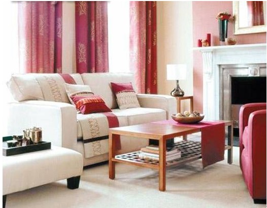米白背景墻很好的凸顯出暗紅色綢緞窗簾,沙發(fā)中央放置原木色茶幾緩和居室色調(diào),讓沙發(fā)一角變得更加溫馨、舒適。