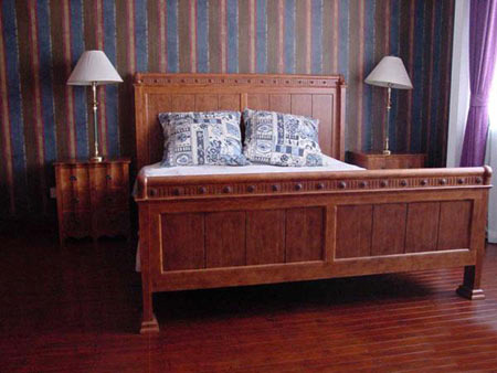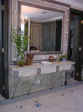 我家里的很多木制的門、書柜、櫥柜都是有呼吸、有生命的。即便有些地方刷上了大綠,別人可能會想綠色很怯,但經(jīng)我處理以后,這個綠是透明的。每一處木頭的顏色都反復(fù)做了很多遍,手撫摩的時候非常有質(zhì)感。有些人看了以后說:´噯,你這不錯,我也學(xué)學(xué)。´我告訴他們怎么弄的,都回去做了,結(jié)果沒一個人做出來是這意思。知道為什么嗎?──偷懶!中國人怕麻煩,各行各業(yè)都想省事。我這個漆反復(fù)打磨了7、8次,干了,砂輪磨掉,再用很淡的水彩顏色刷,漆了一個月??伤麄?天就干完了,一共才刷了2、3回。工序到不了,不來這效果。要想讓木頭不是´死´的,就要用很豐富的顏色沁在木頭里面,反復(fù)摩擦反復(fù)吃進(jìn)去,就像畫油畫一樣,反復(fù)畫很多層和你只畫一遍出來的質(zhì)感是不一樣的。