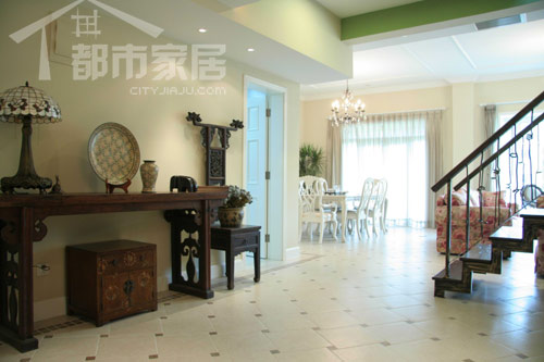 這是初進(jìn)門時(shí)展現(xiàn)在我們眼前的情景。明亮的日光透過紗簾來,整個(gè)房間沒有太多隔斷,感覺上開闊通透極了。左側(cè)的一組中式家居配飾搭配很醒目,紅木條幾、小木柜、瓷盤瓷瓶、老式臺燈以及一把靠背超高的凳子,這租搭配其實(shí)是隨心所欲而為之的,卻顯然成為了別墅入口處最隆重的一角。