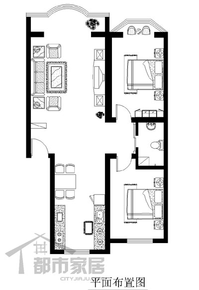 這是一套面積70平米左右的兩居室,戶型很規(guī)整,比較獨(dú)特的是餐廚沒有分開,不知道開發(fā)商是不是引進(jìn)了開放式廚房的生活新理念。另外不太令人滿意的一點(diǎn)是進(jìn)門即看透整個(gè)客廳,沒有玄關(guān)也就沒有足夠的私密感。