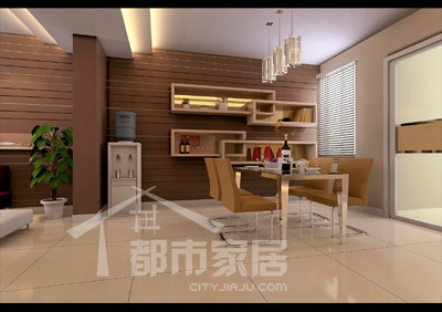 沙發(fā)背景墻上勻稱的橫線條使視覺效果得到延伸,并且一直延伸到了餐廳區(qū)域。背景墻的實(shí)現(xiàn)手法是最常見的石膏板造型,每隔15公分劃一道線,每道線開半公分的小槽,然后再刷上淺咖啡墻漆就完成了。