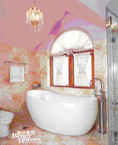 女孩房的衛(wèi)浴間:淺紫色的屋頂相比白色更有柔美感,褶皺的紗簾也別具小女生情調(diào)。獨(dú)立浴缸看起來有漂浮感,頗具裝飾性,讓其成為注意力的焦點(diǎn),可掩飾衛(wèi)浴間過大帶來的視覺空曠感。
