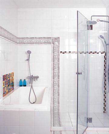 玻璃屏后的墻壁用藝術(shù)瓷磚或馬賽克裝飾,浴室里立刻有了靈動(dòng)的氣息。