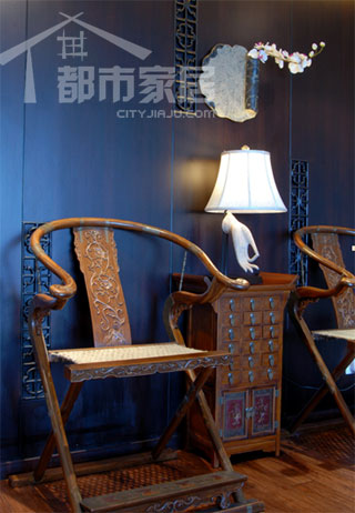 整體亞光朱黑色處理的背景墻以一個“如意”的樣式元素聯(lián)系在一起、做了鏤花雕刻。