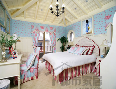 天花板的造型很漂亮,設(shè)計(jì)師模仿的是海邊小木屋里木結(jié)構(gòu)外顯的天花板,頗有度假屋的自然風(fēng)情。天花板被涂刷成奶油色,和藍(lán)色、粉色搭配在一起凸顯的是純真可愛的少女氣質(zhì)。