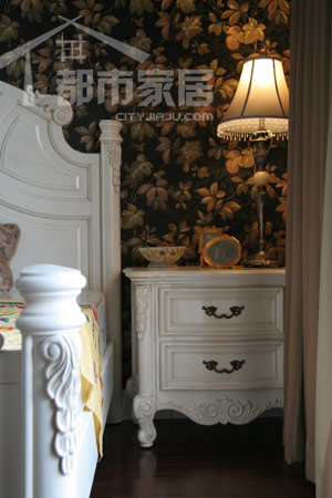 顏色的重要性同樣體現(xiàn)在主人的臥室里。黑色的花朵壁紙,沒錯,設(shè)計(jì)師用的就是大膽而絕配的黑色壁紙,一下子就烘托起神秘、幽靜的氛圍來。然而因?yàn)橛辛硕涠涮S的白色花團(tuán)的點(diǎn)綴,墻面一點(diǎn)兒也不顯得壓抑。臥室里的家居配飾一律為歐式風(fēng)格。
