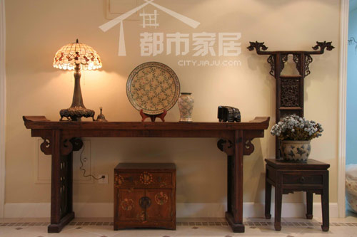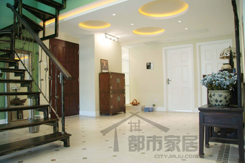 這是初進(jìn)門時展現(xiàn)在我們眼前的情景。明亮的日光透過紗簾來,整個房間沒有太多隔斷,感覺上開闊通透極了。左側(cè)的一組中式家居配飾搭配很醒目,紅木條幾、小木柜、瓷盤瓷瓶、老式臺燈以及一把靠背超高的凳子,這租搭配其實(shí)是隨心所欲而為之的,卻顯然成為了別墅入口處最隆重的一角。