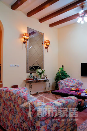 小編我覺得這彩色的沙發(fā)可真像是一朵朵綻開的大花??!客廳鐵藝邊幾和天花板上的木梁分別是地中海和鄉(xiāng)村風(fēng)格的代表。兩種風(fēng)格用得都不多,因此倒也搭配協(xié)調(diào),沒有沖突感。