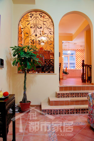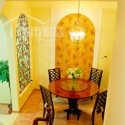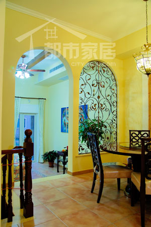 客廳的旁邊踏上幾個(gè)臺階就是餐廳,這里也是設(shè)計(jì)師唯一做了墻體結(jié)構(gòu)改動的地方。大家注意一下圖中左邊的鐵藝拱窗和右邊的拱門,其實(shí)原本客廳通往餐廳的門就位于左邊的拱窗處,但后來設(shè)計(jì)師把原本的門砌成了拱窗,又在拱窗右側(cè)新開了一個(gè)拱門。這不是有一點(diǎn)多此一舉嗎?我猜大家都有點(diǎn)納悶了。其實(shí)這是設(shè)計(jì)師考慮了風(fēng)水因素后而做出的改造。從客廳向餐廳看,原本的門(現(xiàn)在的拱窗)就正對著別墅的前門,照片中拱窗隱約露出了半截門。再反過來看看下圖。