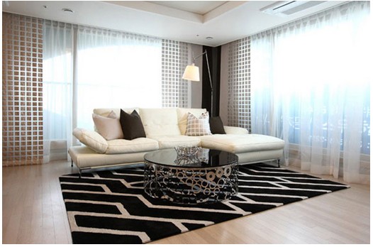 時(shí)尚現(xiàn)代的空間內(nèi)擺放白色沙發(fā)、黑色地毯,白與黑的經(jīng)典搭配,在杏色窗簾的柔和過度中散發(fā)著家的溫馨。淡黃色的吊頂讓人更容易放松心情,卸去一天的疲憊。深咖啡色的應(yīng)用,讓白、黑、杏色之間有一個(gè)更好的和諧過度。