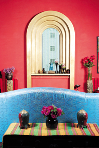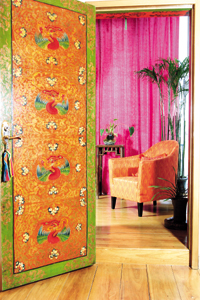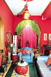 張聰和艷潔愛(ài)旅行,因?yàn)槿ミ^(guò)的地方很多,在裝修自己房子的時(shí)候,他們就想把旅行中留下的美好記憶放在每天都看得到的地方。于是,他們沒(méi)有像很多收藏者一樣,把淘來(lái)的寶貝仔細(xì)地放置起來(lái),而是將這些東西當(dāng)成了美化家居的裝飾品。來(lái)自尼泊爾的絲質(zhì)靠墊隨意地散落著,自己設(shè)計(jì)制作的沙發(fā)讓人想起泰國(guó)那些鼓蕩在風(fēng)中的華美沙麗,金色的窗子,是幾個(gè)拱形一層一層地疊進(jìn)去,這種地中海風(fēng)格的經(jīng)典造型在房子中隨處可見(jiàn),來(lái)自**的巨大廟門裝飾了樓梯邊的一整面墻壁,還有從各地收集來(lái)的老家具和傳統(tǒng)藝術(shù)品……每一處,都有不同國(guó)度的風(fēng)情在旖旎著。