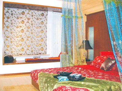 而紗簾也在此發(fā)揮到極致。所有的窗簾都是紗質(zhì)的,以藍色和紫色為主,隨風(fēng)飄曳,怎么看都是一幅東南亞風(fēng)情。臥室里的床品多是以泰絲和麻織品為主,混合陶土的紅色床品熱情奔放,而飄逸在床兩側(cè)的藍色紗簾則和紅色床品以及印花的窗簾互相映襯,營造出舒適飄逸的浪漫氣息。