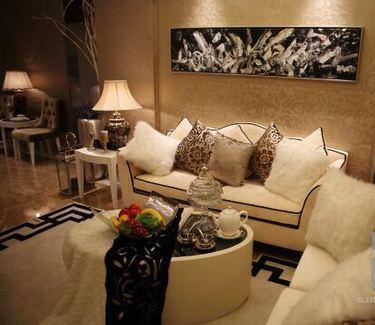中國風的地毯將會客廳顯眼而莊重地突出,圓桌上看似隨意鋪擺的羊毛毯子令會客廳的氛圍變得較為輕松舒適,降低了整體奢華帶來了壓抑緊迫感??蛷d里最為搶眼的當數(shù)電視機旁邊的雕像了,不管是栩栩如生的漢朝人頭雕像還是座臺上的歷史悠久的中國文字,都讓房間彌漫著濃濃的中國文化氣息。