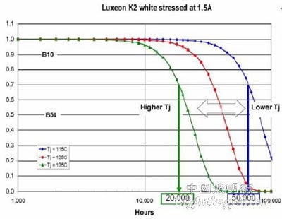 實際上,LED壽命問題主要是由于長期在高溫下工作而形成的問題。在不同結(jié)溫時的壽命如下圖所示: