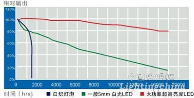 現(xiàn)在有的商家,為了降低成本,就采用幾百只φ5的小功率LED。然而這種小功率的LED的光衰是非常嚴重的,按照其光衰至80%的壽命只有1000小時。所以,作為需要長期使用的路燈是絕對不能允許采用這種小功率LED的。作為大功率LED,其光衰就要好很多。然而國內(nèi)不少廠家也還是只能做到10000小時下降10%。遠遠不能滿足使用要求。