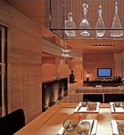 無須硬性劃分,只是通過燈光的不同效果就可以暗示出不同的功能區(qū)。餐桌上強(qiáng)烈的射燈光線透過玻璃與水晶瓶散落在桌上,光影錯(cuò)落,形成獨(dú)特的效果。
