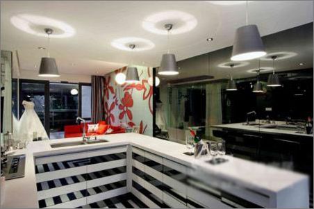 2、室內隨處可見的花朵圖案,完全滿足了女性追求美的需要,像客廳紅色沙發(fā)倚靠著白色背景、紅色花瓣的墻面;隔開廚房通往其他空間的一整面鏤空植物造型墻;臥室墻面上的大型花瓣,花朵的獨特造型是居于此的人對美麗事物的執(zhí)著追求的體現(xiàn)。就連浴室內純粹的黑、純粹的白,無不在述說著時尚和女性的精神涵義,整個空間在各種元素的相互作用下互動著,進而向人們傳達一種柔美、時尚的居住空間,如同一場空間交響樂,線條伴隨著音符不停的舞動……