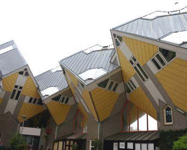 這個立方體房屋建于荷蘭,設(shè)計師把傳統(tǒng)的房子轉(zhuǎn)了45度,架在一個六邊形的柱子上,這樣三個面朝上,三個面朝下。每個房子有三層,底層包括廚房、書房和浴室,中層是臥室,頂層則是一個金字塔式的閣樓。