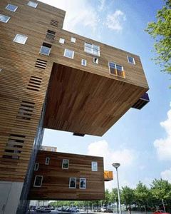 90年代末“沃佐科住宅(Wozoco Apartments)”是建在荷蘭阿姆斯特丹市的一種外掛式住宅,荷蘭的房屋設(shè)計規(guī)定公寓必須為住戶提供足夠多的陽光,由于有限的樓層高度和南北向的條件限制,100套公寓不可能放置在一個常規(guī)的體塊中,最多只能容納87套,為了解決高密度問題,所以設(shè)計師把另外的13個公寓掛在外面