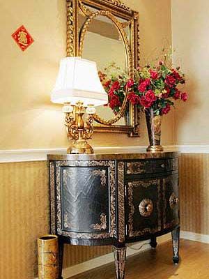 要想裝飾出一個有氣氛的空間,一些可愛的小飾物是必不可少的。例如,在玄關的墻壁上可掛些風景裝飾畫,美麗的景色讓人一進門就心曠神怡;掛一幅與家人合拍的照片或是小型掛毯,可以感受到家庭的溫馨;或者掛上一面鏡子,不論是方形或是長形,都有不錯的效果,既可擴大視覺空間,又可在主人出門前檢視儀容。小擺件及布藝品更是調(diào)節(jié)氣氛的好幫手,找一個與玄關顏色相配的小花瓶,插上幾枝干花或是小的鮮花,也一樣有情有景。另外像別致的相架、精美的座鐘、古樸的瓷器等都是不錯的選擇。玄關雖小,但其中樂趣融融,只要您稍加留心,玄關就會成為家中的第一道風景。