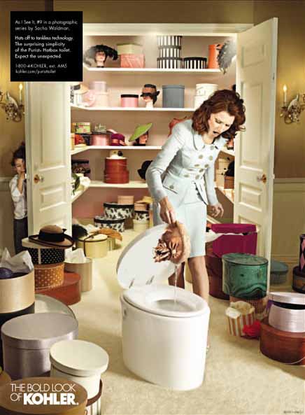 初看Kohler的這幾組雜志廣告,首先是被畫面豐富的故事性所吸引,然后才注意到產(chǎn)品——這與一般廣告突出產(chǎn)品的做法極為不同。同時,與一般強調(diào)產(chǎn)品清潔干凈質(zhì)感的表現(xiàn)方法不同,幾位出色的攝影師戲劇性甚至有點超現(xiàn)實的表現(xiàn)手法也頗讓我吃驚。
