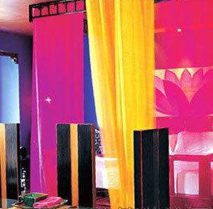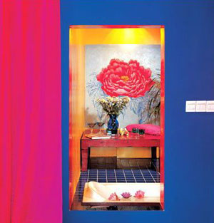 一踏進(jìn)門,恍若隔世。一個(gè)極濃艷的、有蠢蠢欲動(dòng)的香氣的房間,簡直驚世駭俗:極純的藍(lán)、極艷的粉、極亮的明黃,金色的頂,黑色的地,純粹得讓人窒息的色彩,就這么轟轟烈烈地蔓延,和隨處可見的藏式家具一起,把空間裝得滿滿的。加上幽幽暗暗的燈光,曲曲折折的通道……