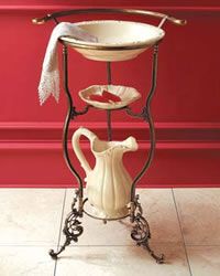 幾十年前,我們就已經(jīng)見(jiàn)過(guò)類(lèi)似的洗臉架了,只不過(guò)當(dāng)年以木制為多,上面一格放著臉盆,下一格就放肥皂盒之類(lèi)的,背后還有一個(gè)架子可以掛毛巾擦手。在歐洲,這樣的款式才是經(jīng)典,看似老派卻從未落伍,特別是那只倒水的壺,線條極其優(yōu)雅。