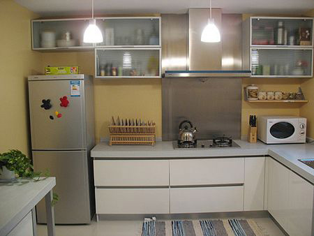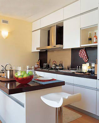 圖一中的廚房就是通過局部重色的點(diǎn)綴,然后配比大面積的淺色系地磚,讓居室空間看上去高挑但又不失重點(diǎn),葉國(guó)密說,開放式廚房的頂面采用磨光的黑色石材,表面光滑如鏡,能夠反射居室光線,與高亮度地磚形成強(qiáng)烈對(duì)比,這種方式不僅可以在開放式廚房中使用,對(duì)于小戶型的吊頂也不失為一種劍走偏鋒的方式。
