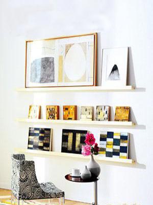 可以用在墻面上釘層板的方法解決掛畫的問題,長度依墻面而定。這樣,你不需要把墻面摧殘得千瘡百孔,還方便根據(jù)心情隨時(shí)調(diào)整畫的位置或者更換新購置的作品。畫的擺放要根據(jù)尺寸和內(nèi)容,過于零亂或者死板都影響效果。