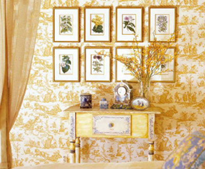 挑選畫作時(shí)要考慮它們是否與墻上其它裝飾性圖案沖突。畫作的相框色彩與壁紙的柔美色調(diào)吻合,與壁紙相得益彰。