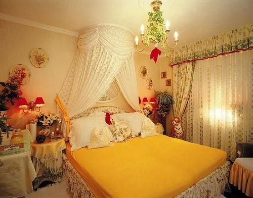 臥室中既然以床為中心了,其它飾物一般就應(yīng)有“退居二線”的 襯托意識。如窗簾,面積較大,太艷、太豪華了,就會與床飾形成兩個“中心”,以至讓人眼花 繚亂。故窗簾應(yīng)選用相應(yīng)一點兒的色彩、圖案、面料,像一個“仆人”站在床邊。