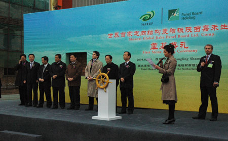 2009年2月25日,陜西環(huán)球嘉禾板業(yè)有限公司麥秸定向結(jié)構(gòu)板生產(chǎn)線工程奠基典禮儀式在楊凌示范區(qū)隆重舉行。陜西省副省長、楊凌示范區(qū)管委會主任姚引良,楊凌示范區(qū)黨工委書記、西北農(nóng)林科技大學黨委書記張光強,陜西省人民**副秘書長史俊通,管委會副主任郭建樹、張宏,建設部住宅產(chǎn)業(yè)化中心婁乃琳,中國建材總院副院長隋同波,陜西省環(huán)保局副巡視員連鋒,德國Mayfair財團老板Christian Herz、執(zhí)行總裁Rainer Kutzner,荷蘭Panel Board Holdings農(nóng)業(yè)纖維板材有限公司總裁Krijn Leendertse等有關(guān)方面領(lǐng)導和企業(yè)界朋友出席了奠基儀式。