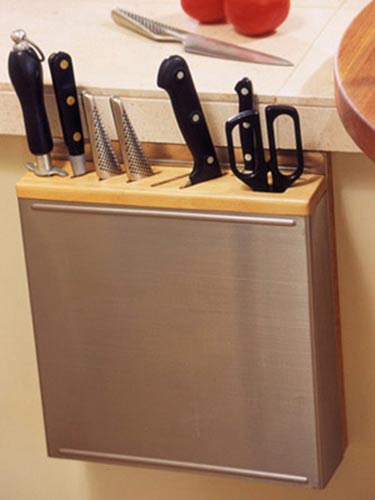 把刀具等利器放在一個(gè)不銹鋼的盒子里。盒子可以固定在柜臺(tái)的一側(cè)。如果家里有小孩子,那盒子最好安在櫥柜門的內(nèi)側(cè)。